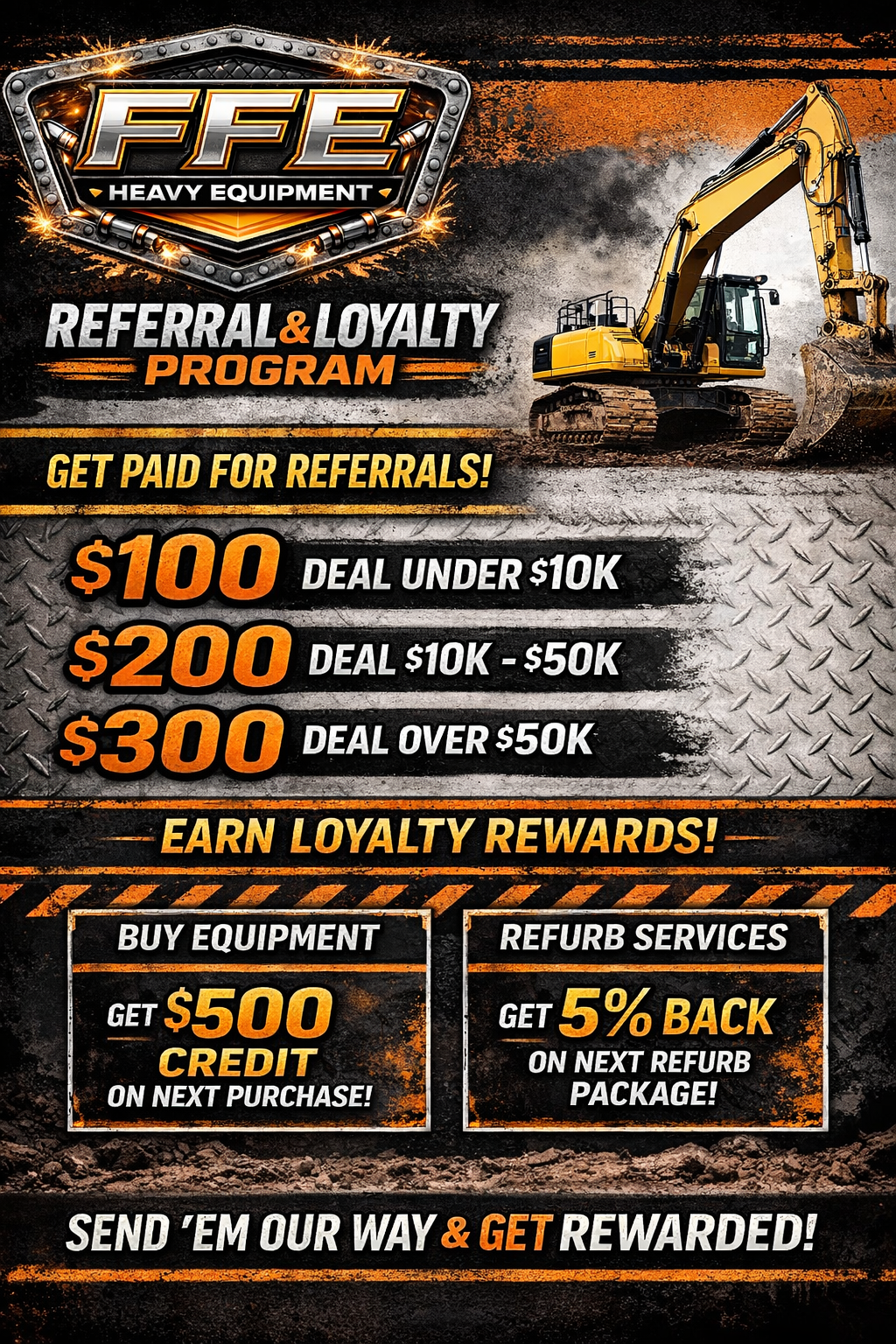 We are proud to offer a reward system for being loyal customers. When you buy a piece of equipment from us, You can earn UP TO $500.00 off your next purchase or refurbish package. If you refer a customer to us and they buy a piece of equipment, and mention your name for sending them to us, you earn CASH. It is THAT easy.